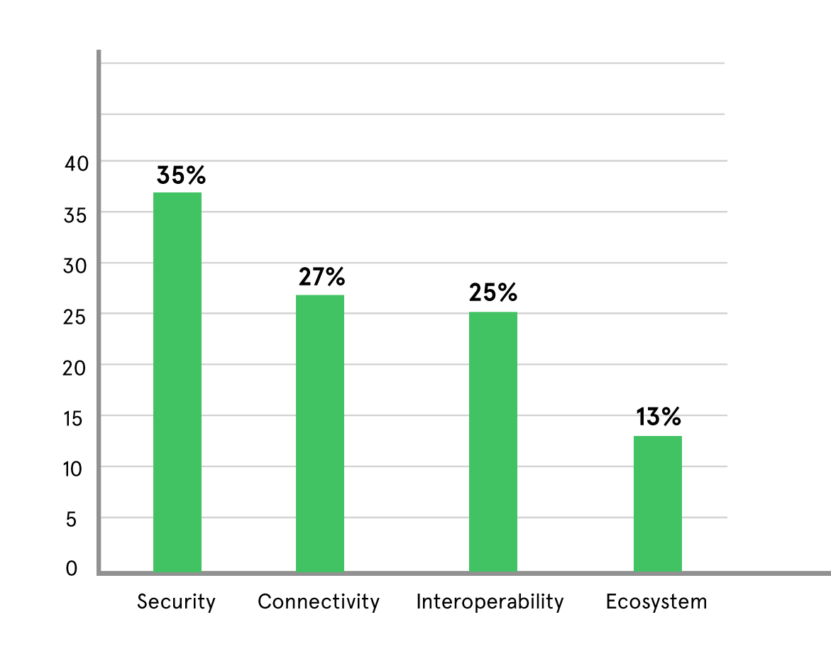 Unsere jüngste Umfrage zeigt, dass Datensicherheit und -schutz für 47 % der Befragten der wichtigste Aspekt im Hinblick auf IoT-Lösungen ist (Rückgang um 5 % gegenüber den Ergebnissen des Vorjahres). Lieferanten und Entwickler sind vorsichtiger als je zuvor und arbeiten hart daran, die bestmögliche Verschlüsselungs- und Sicherheitstechnologie zu implementieren, um nicht-kompromittierbare Lösungen auf den Markt zu bringen. Die Kommunikationssicherheit bleibt nach wie vor das zweitgrößte Anliegen. IoT bedeutet vernetzte Geräte, und dabei darf die Verbindungszuverlässigkeit nicht übersehen werden.