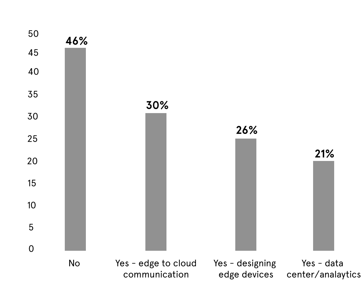 Basierend auf den Umfrageergebnissen verwenden 49 % bereits KI in ihrer IoT-Implementierung. Maschinelles Lernen (ML) ist mit 28 % der am häufigsten verwendete KI-Typ, gefolgt von Cloud-basierter KI (19 %). 51 % der Befragten zögern jedoch, KI zu verwenden, da sie neu in der Technologie sind oder spezialisiertes Fachwissen zur Implementierung von KI benötigen würden.